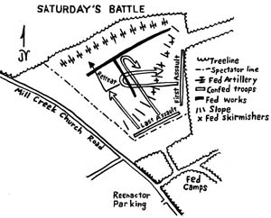 I am disgusted to see a “Federal” reenactor in shirtsleeves with a “CS” beltplate and gray trousers. To keep numbers equal, the sponsor permitted excess rebels to galvanize as Yankees. However, the sponsor obviously failed to enforce standards as to the minimum required for a Federal impression. Despite this lapse, the general authenticity level of the troops is comparable to the Blue-Gray Alliance events.