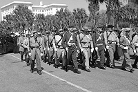 As the blocks began to turn into miles, the sun rose higher in a clear Carolina Blue umbrella sky. If there was any wind, we couldn't feel it. The heat, weight of our musket and the uncomfortable way in which we had to carry it were beginning to tell on us. I kept looking over my shoulder at my son, hoping he would not say, "Dad, I can't take it any more." He looked tired and strain was showing on his face but he never uttered a word of complaint. To add to our discomfort, the whole procession was a march. Typically when we are in a parade or long march we eventually go into what is called a "route step". You don't have to keep time with the drummer or move your left and right feet in unison. Since this was a funeral we were required to march the whole way in unison. It looked good, sounded good but sure wore us out. Periodically, the captain would order us to change the position in which we carried our musket. Company! Support Arms! A little while later, Company! Right shoulder shift! And then back to Company! Shoulder Arms. Each time we changed positions the musket seemed to get just a little heavier. And so it went, mile after mile.